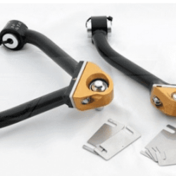 The Top Secret Upper Control Arms use shims in combination to provide a wide range of camber adjustment. The inner bushings are upgraded over stock with more solid, pillowball bushings to provide a more solid suspension feel with more efficiency as the factory rubber bushings compress under load, causing minute changes in geometry
